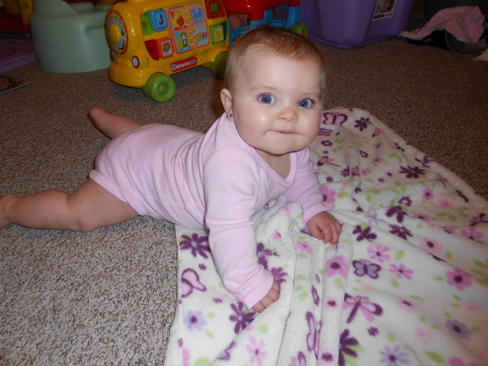This was a HUGE month for you! 2 days after you turned 6 months old you rolled over FINALLY!!! Since then you have mastered rolling from belly to back AND back to belly! Yes, that means you are never in the same spot I leave you in. You roll all around the room and roll to get things you want. You still "rev up" to roll from back to front. Its pretty cute! Its all those rolls you have :-) You are still very chubby! In fact I switched you to 6-9 month clothes in the middle of December and 90% of them already dont fit! There was so many outfits you never got a chance to wear cause by the time I got around to putting them on you I couldnt squeeze you in them. You are almost in the same size diapers as your big brother! You have passed up your OLDER cousins in diaper size as well! You LOVE solid food! You eat solids 3 times a day. You still arent a fan of many veggies. Especially green ones! You gag and shake every time we give them to you, Its pretty funny actually. You are a really happy baby most of the time. You only get fussy when you are hungry or tired. Sleeping through the night still needs some work though. We all love you so very much!! Please quit growing so fast baby girl!!!